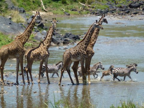 Now, on our penultimate game drive, we all watched incredulously as a tower of giraffes, apparently indifferent to the presence of the infamous enormous crocodile, assembled in the stream right at the crossing. Widely believed to be mute, giraffes do have an amazing capacity to communicate with each other, and apparently, with other species as well. Their presence and body language assured the alpha zebra that they would stand as crossing guards, and the zeal of zebras, with their tower of giraffes offering a measure of protection, thundered across the river to the safe sanctuary of the south bank. At one point, one giraffe moved further up the north bank to signal to the remaining half of the dazzle to cross. Jan peered through her long lens and followed her bliss. I secretly hope the croc would make a kill. John and Sam, with two lifetimes in the Masai Mara, had never witnessed giraffes intervening in the predator prey dance of zebra and crocodile. The final zebra splashed up the south bank joining the safety of the others as they reassembled and resumed their southern migration with their customary zeal. The tower of giraffes morphed into a journey of giraffes, and they moved onward into the fading African light. Sam fired up the Land Cruiser, and we headed back to camp for our final sundowner in Kenya.