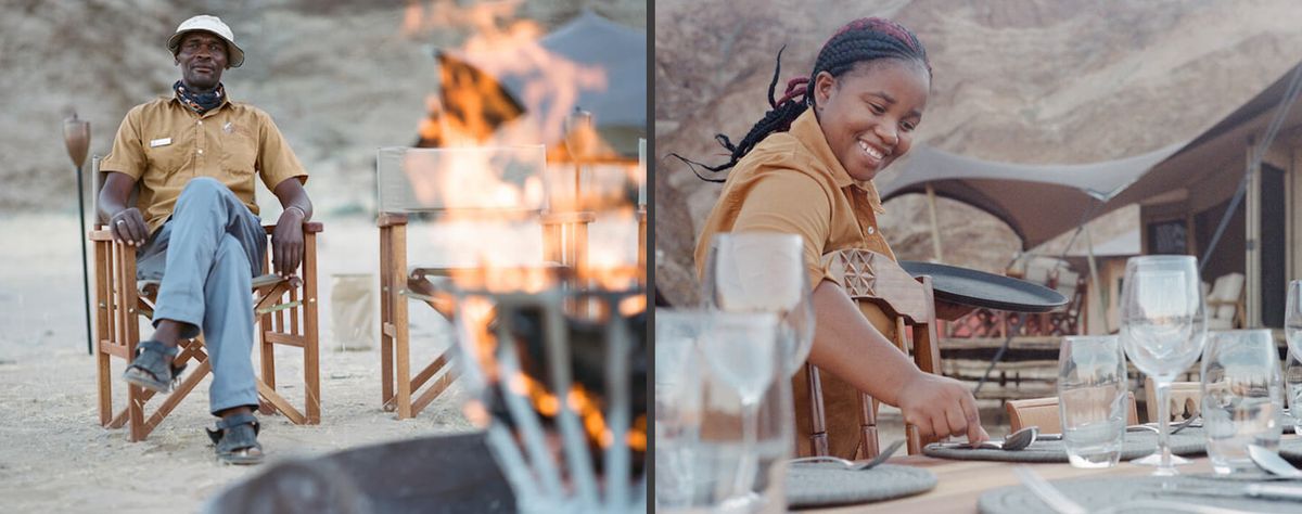 Another unexpected element that makes the camp come to life in an authentically Namibian way is the staff and their uniforms. Natural Selections, who operate the camp, have moved away from the typical idea of a uniform where everyone dresses the exact same. Instead, they have curated a collection of different style pants, shirts, skirts, belts, hats and scarves so they can mix and match to create a look that is all their own, while still professional. This seemingly small move makes the camp feel even homier. Every personality shines through and the staff feel like your family, welcoming you into their home. It allows local traditions and culture to shine in their tourism setting in an effortless and relaxed way.
