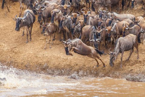 As they pour into the Serengeti, they face one of their biggest challenges of the year: crossing the Mara River. Swirling currents and eager predators stand between them and their next meal – the grass is always greener on the other side after all. The herds pile up along the banks, waiting for hunger to overtake anxious fear as a single, brave creature wades into the river. This is the only nudge the rest need, starting a veritable stampede down the banks and into the muddy waters.