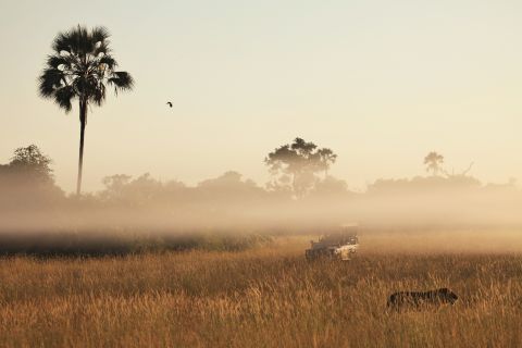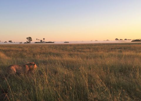 After a mug (or two) of coffee and a bite to eat, we head out. It is May, and winter’s purchase is quietly taking hold in the Okavango Delta. The grass is tall and their dewy seed tassels shimmer in the early morning light. A mesmerizing layer of mist sprawls across the grasslands, creating a scene that resonates with something deep inside you.