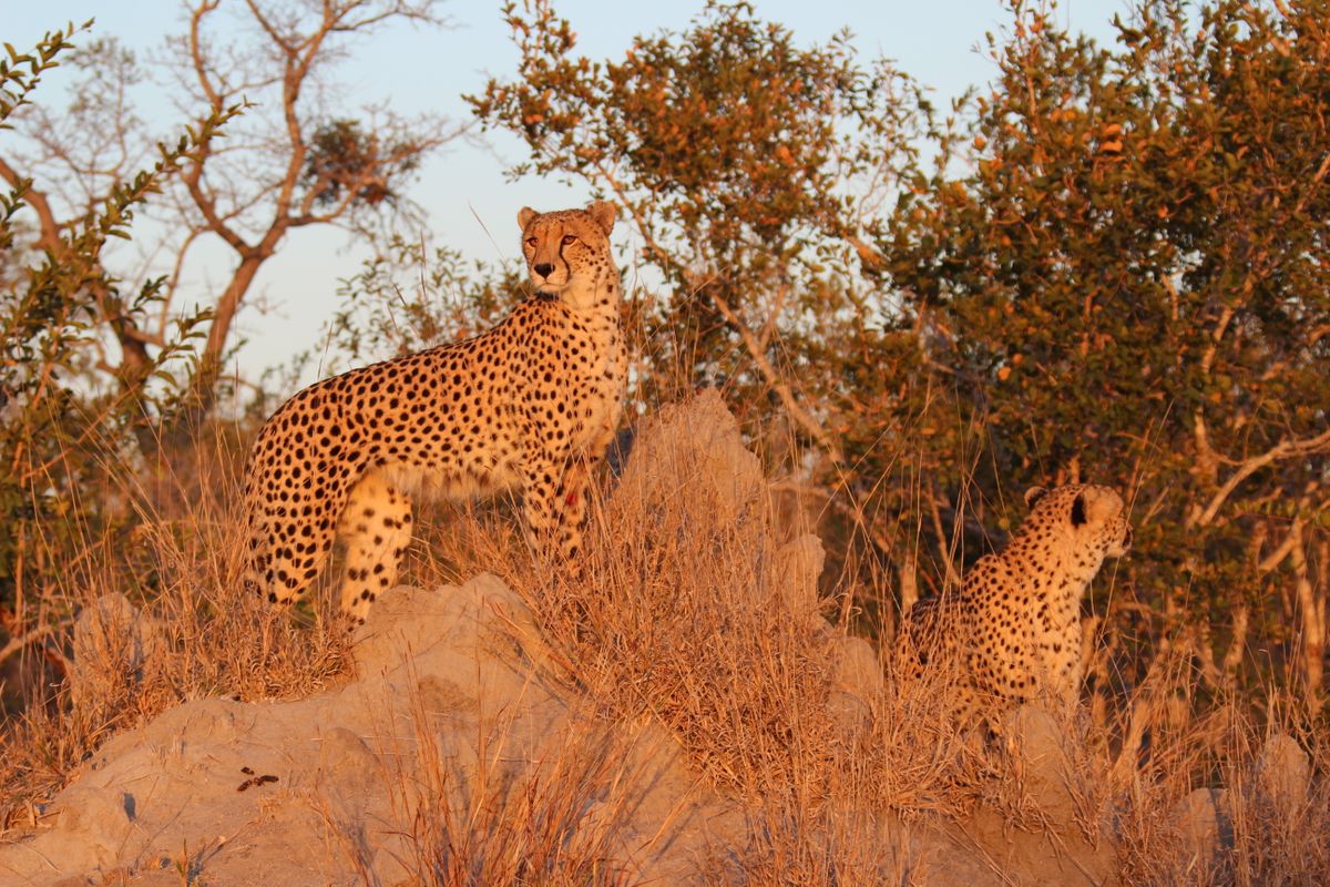 The cheetah's slender, long-legged body is built for speed. They have small heads with flat faces, allowing the their large eyes maximum vision with enlarged nostrils and extensive air-filled sinuses. Their narrow, lightweight bodies have long slender legs and specialized muscles. Their legs have an expanded reach as their hips and shoulders swivel on their flexible spines when running, giving great extension and reach to the legs. Their long tails act as a stabilizer for balance, preventing them from rolling over and spinning out in quick, fast turns during a high-speed chase. They have a powerful heart and large, strong arteries. Cheetahs have short, blunt semi-retractable claws that grip the ground like cleats for excellent traction when running. Their paws are less rounded than the other cats, and their pads are hard, similar to tire treads, to help them in fast, sharp turns.