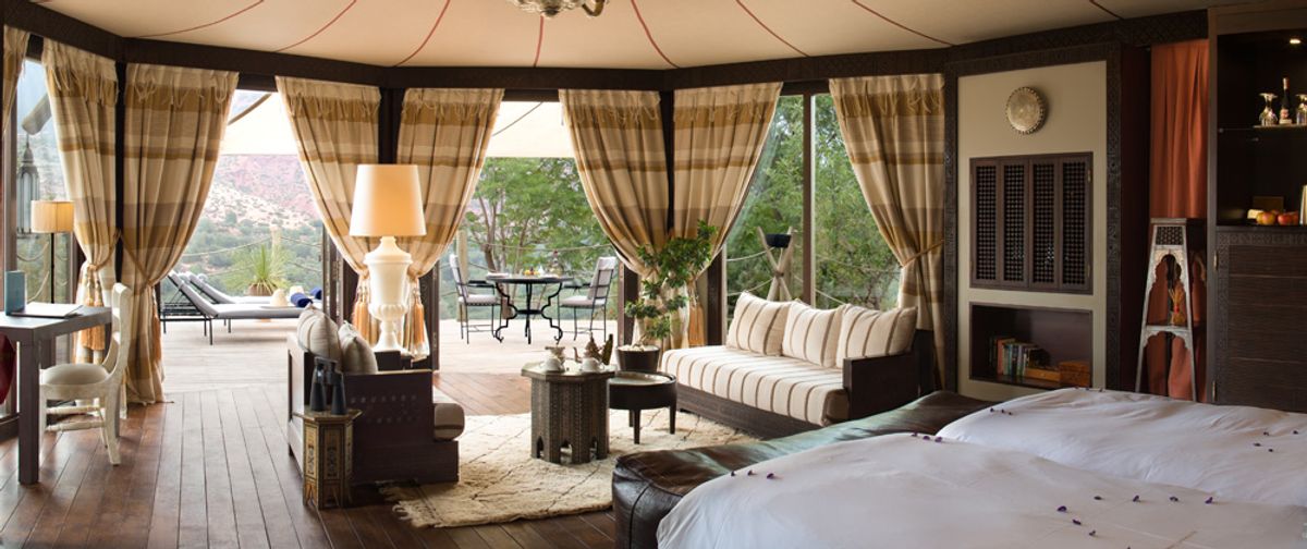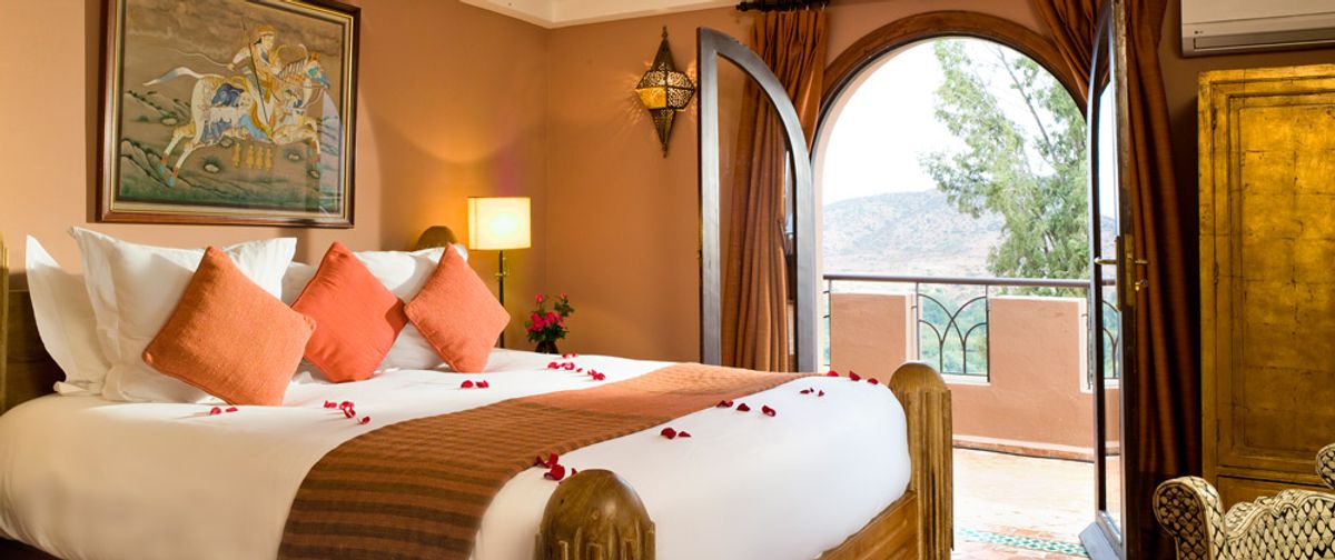 There are 28 bedrooms and suites including ten luxury Berber Tents, some of which have private plunge pools. All are individually decorated using traditional Moroccan furnishings and antiques, as well as items from the vast collection of Luciano Tempo, Kasbah Tamadot's former owner. As a renowned antiques dealer and interior designer, Luciano brought together artefacts from all over the world, many of which feature in the bedrooms. Each room has a uniquely descriptive Berber name which tells you something about it.