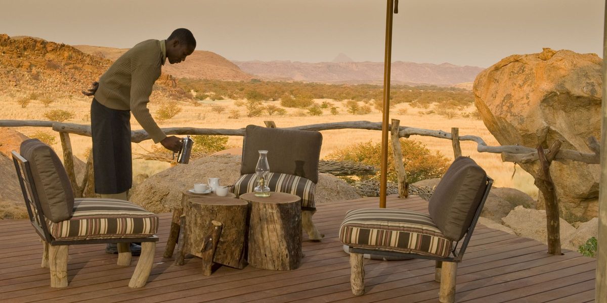 Huddled in the rocks, with sweeping views across the Aba Huab valley, Camp Kipwe is full of surprises, starting when guests first arrive. An inviting lounge area, where birds fly in to enjoy the water seeping from the rocks, a refreshing swimming pool nestled in the rocks and a scattering of bungalows complete this eco friendly camp. The surrounding space and endless views of Damaraland cannot be contained. They beckon you to explore – enjoy an early morning game drive in search of elusive desert dwelling elephants, hike in the ancient surroundings of the Aba Huab River or travel back in time at Twyfelfontein, Namibia’s first World Heritage Site. Local guides have an intimate knowledge and respect for the land that they have built up over a lifetime. With new insight into local traditions, you will come to fully appreciate the geology, botany and wildlife of the area.
