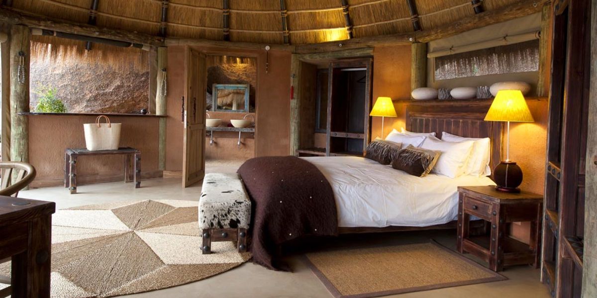 Organic and understated, the nine bungalows and one suite at Camp Kipwe are like extensions of the rocks themselves. Inside the dome shaped space, you feel like entering a secluded cave and becoming one with the landscape. Natural touches – rocks embedded in the floor, animals carved into the wood, mimicking the area’s famous engravings – add to the unique sense of place found at Camp Kipwe. Nestled against the boulders, the partially open, outdoor bathrooms provide a bit of whimsy in the bush, while a small deck extends the living space, connecting guests to the riverbed and the views beyond.