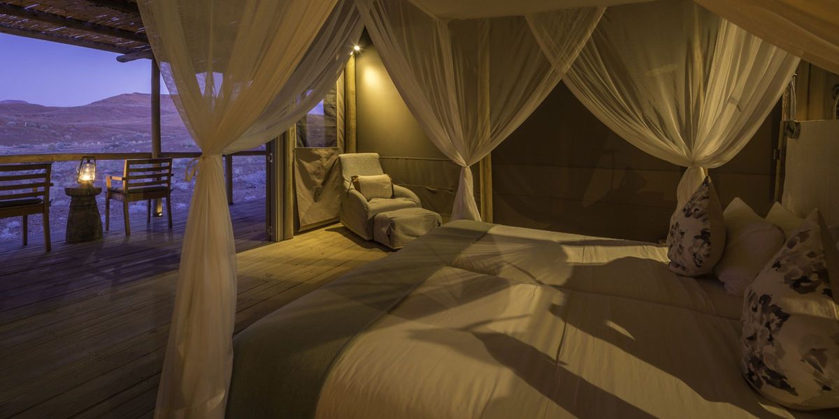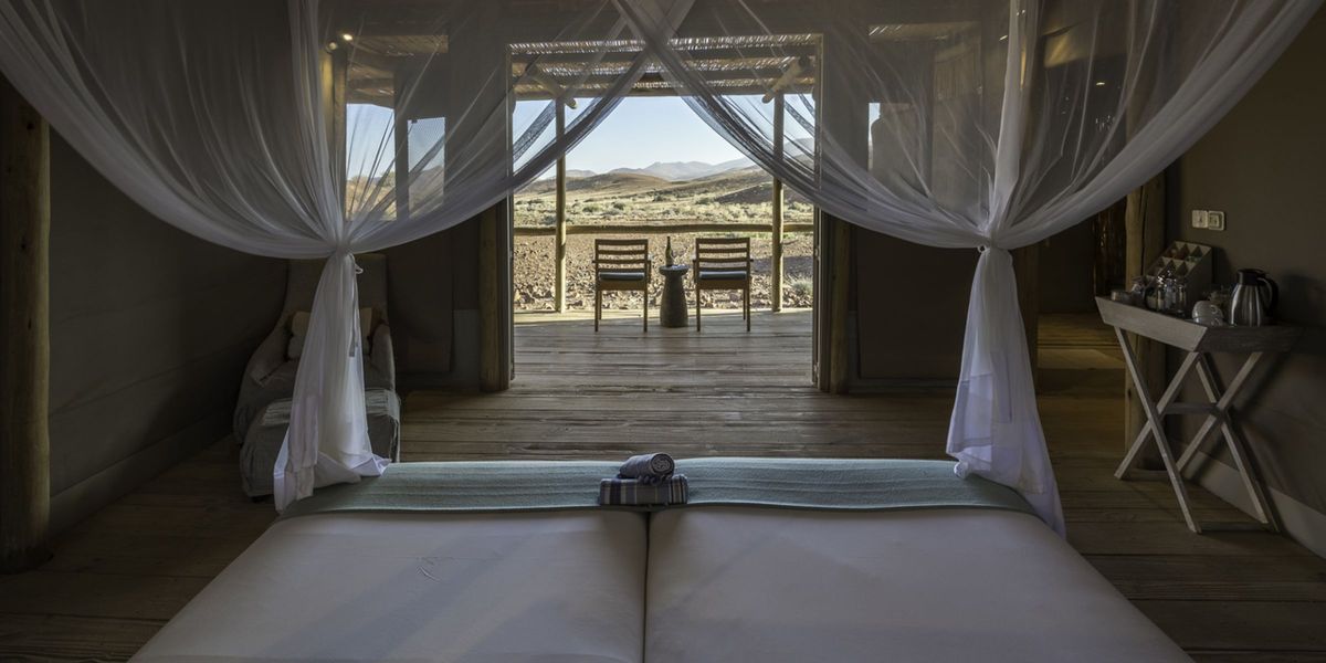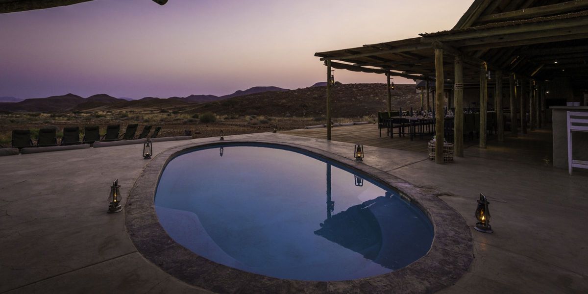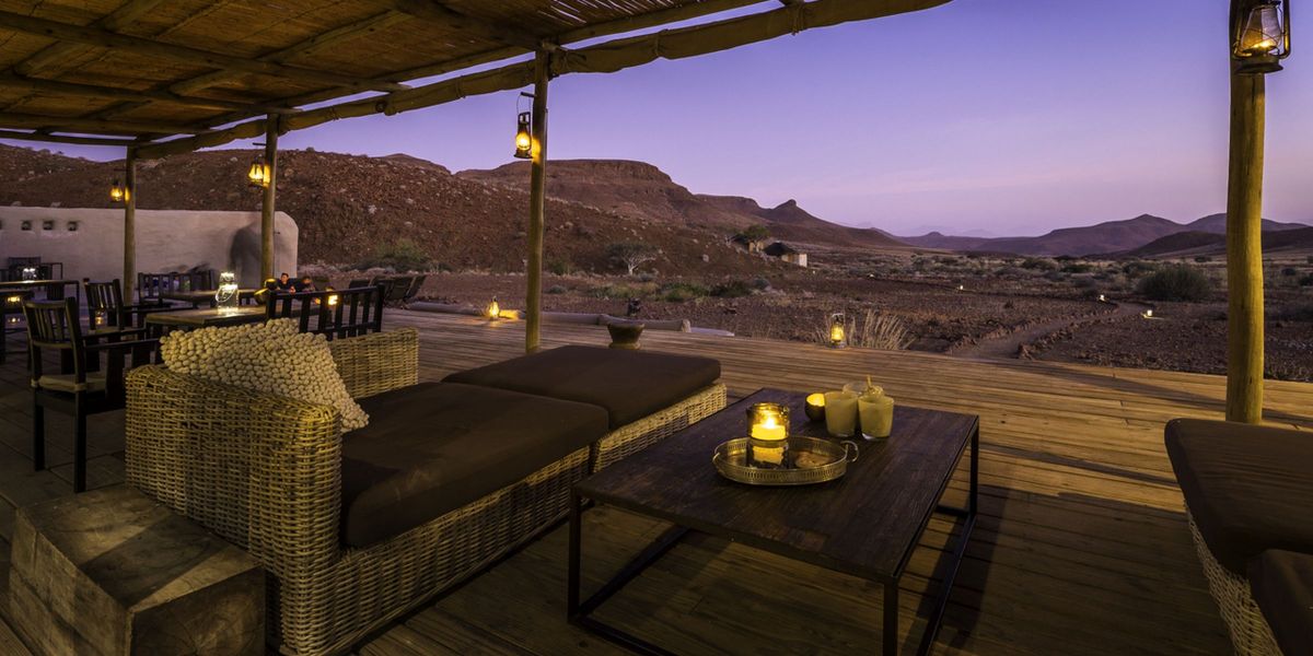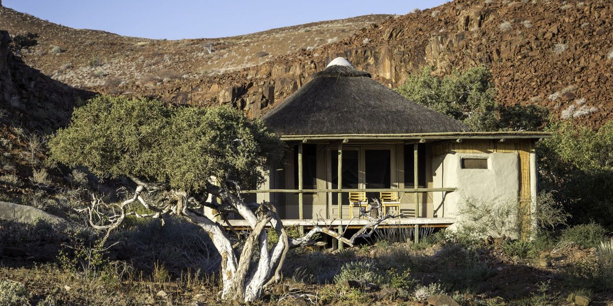 Situated on the northern face of the Huab River Valley and looking south toward the imposing Brandberg Mountains, Damaraland Camp offers its guests endless vistas. Early morning mists generated by the clash between the icy Atlantic Ocean and the warm desert air of the Skeleton Coast, drift inland along the river sand canyon, providing sustenance to the flora and fauna of the region. This comfortable and friendly camp offers walks and drives in one of the best wilderness areas in Namibia.