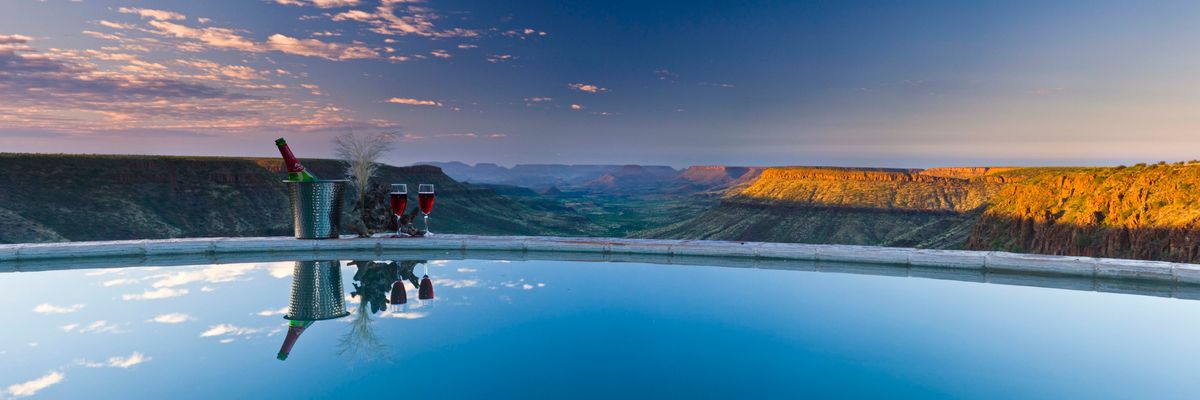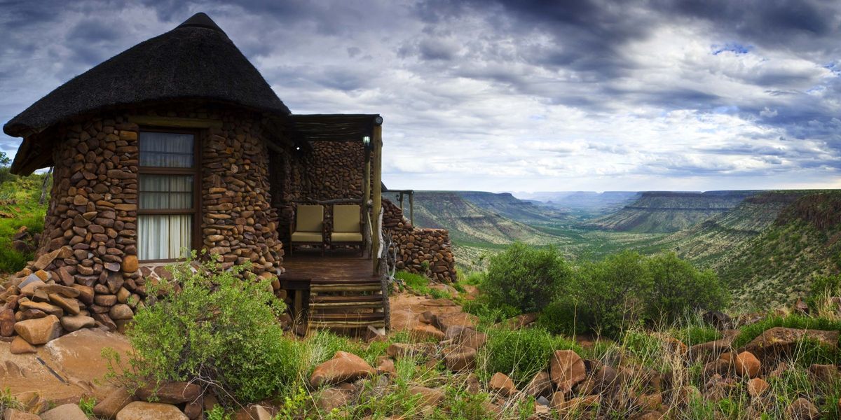 Grootberg Lodge is set overlooking a stunning vista of plateaus and deep valleys that shift between brilliant shades of orange and red to lush greens after the rains. The rock and thatch chalets overlook the Klip River Valley where soaring black eagles can be spotted from private verandas. The rooms are comfortably appointed and blend into the surroundings. Each of the fourteen chalets is en-suite with a writing desk, tea and coffee facilities and comfortable beds with spectacular views of the uniquely breath-taking landscape. They have two spacious family chalets.