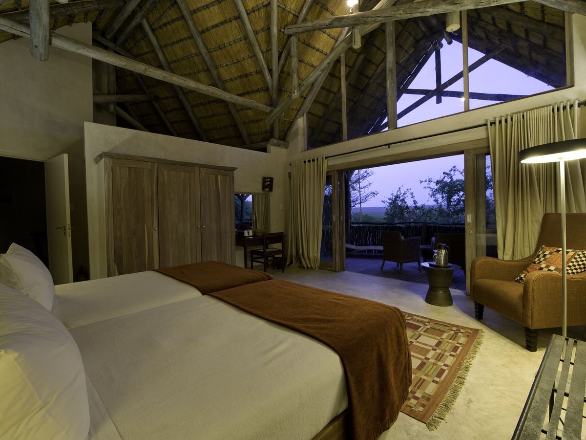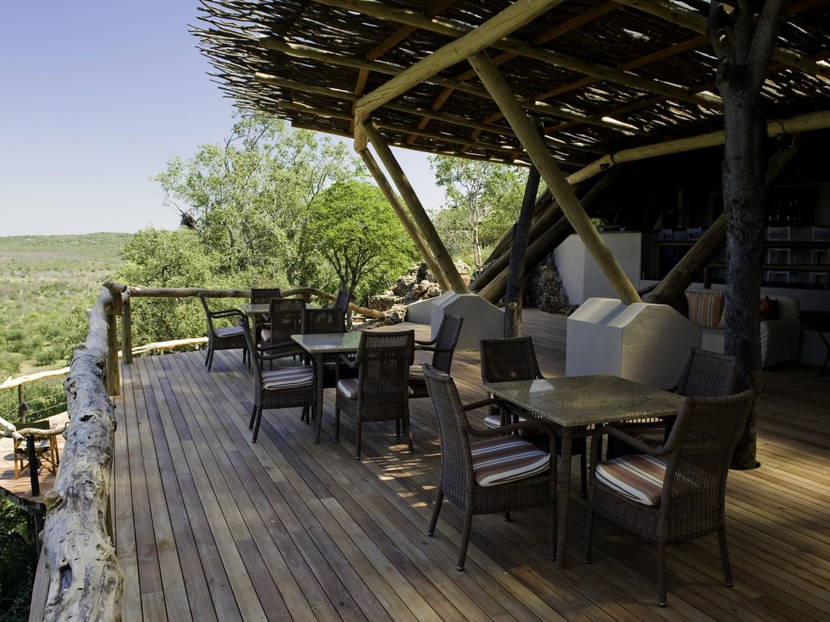 Accommodation comprises of 13 brick, rock and thatch chalets and one family room, each with en-suite facilities. Other room amenities include bathrooms with double basins, indoor and outdoor showers, air conditioning and overhead fan, tea/coffee making facilities and a private wooden viewing deck overlooking the reserve. Meals are either served in the main dining area under thatch with a view over the camps busy water hole, or on the dining deck under the stars. The vantage point of the lodge is stunning. Cool off in the refreshing swimming pool, or spend some time in the curio shop, reference library or at the spotting scope for viewing game.