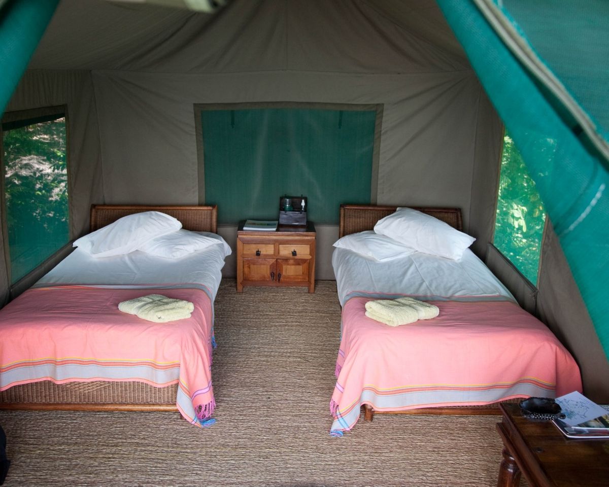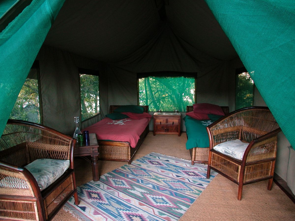 The camp comprises six large safari tents, each fully furnished with its own shaded view-deck and hammock, and blending seamlessly into the lush foliage. There is a dining area and bar, all of timber, thatch and canvas, and adhering to the principles of eco-architecture. The camp was designed with a strong commitment to being green, such as using only solar power.
