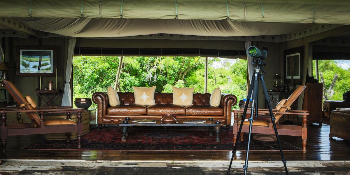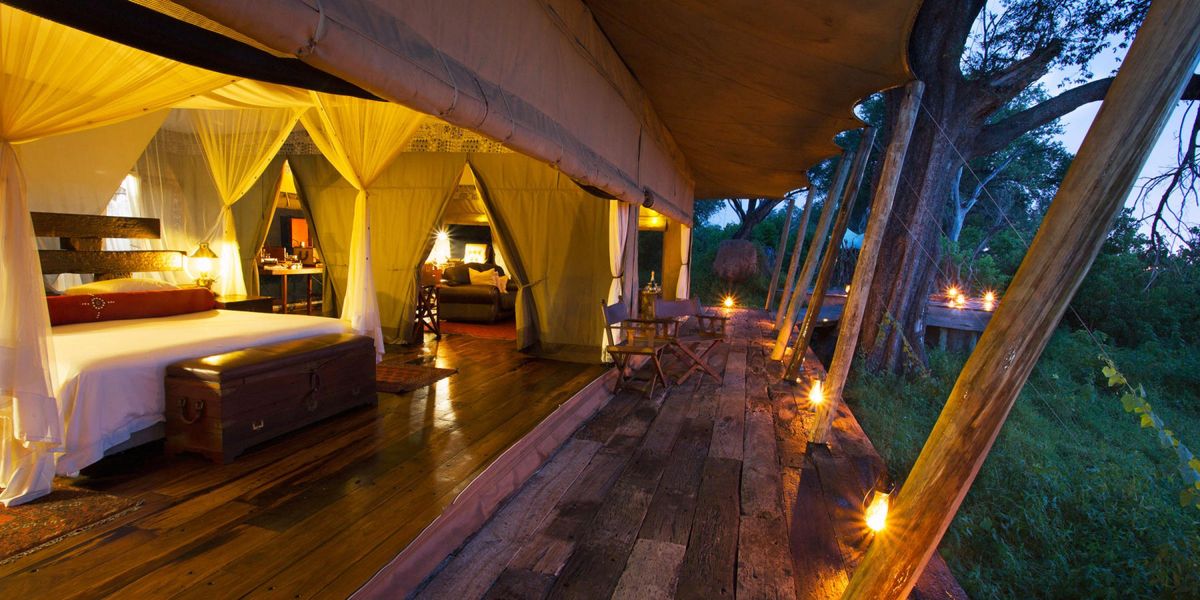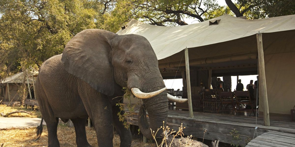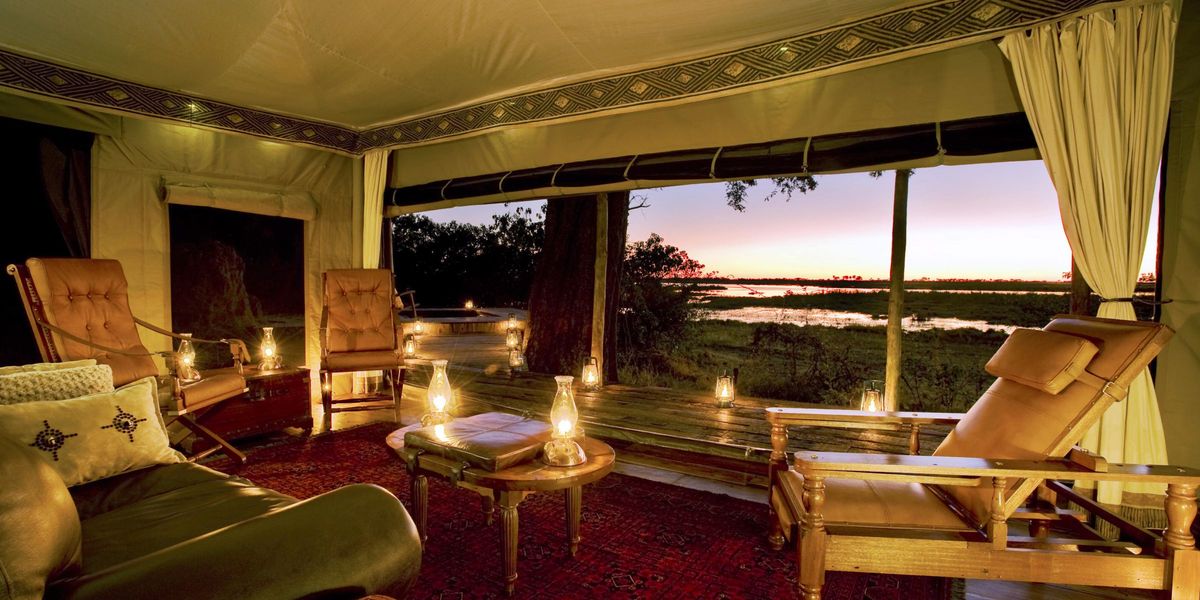 Zarafa Camp, overlooking the Zibadianja Lagoon, evokes a sense of old-style safari elegance with its four large, luxuriously appointed marquis style tents. Each tent with a large veranda and private plunge pool are positioned under cool and shady trees to emphasize the spectacular views. It is comprised of a spacious bedroom and en-suite bathroom with a copper bath and indoor/outdoor shower. The main area evokes the traditional safari ambiance of the turn of the last century. Lounge and dining facilities may be enjoyed under canvas or on the full-length deck shaded by towering trees overlooking the expansive view and the wildlife that pass by. The camp is perfect for those who favor a more intimate and personal experience or for those who prefer the entire camp for their own, exclusive use.