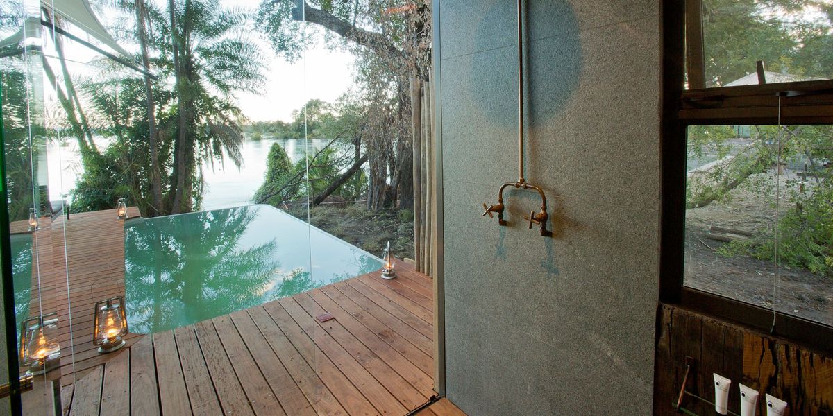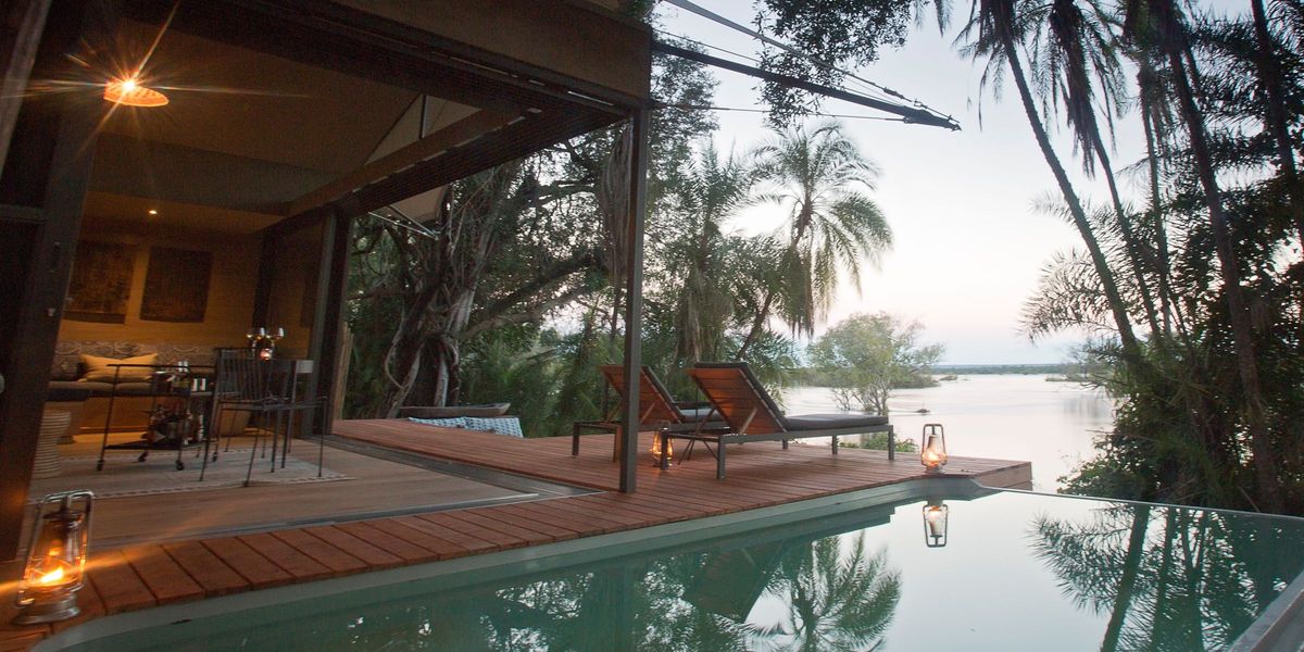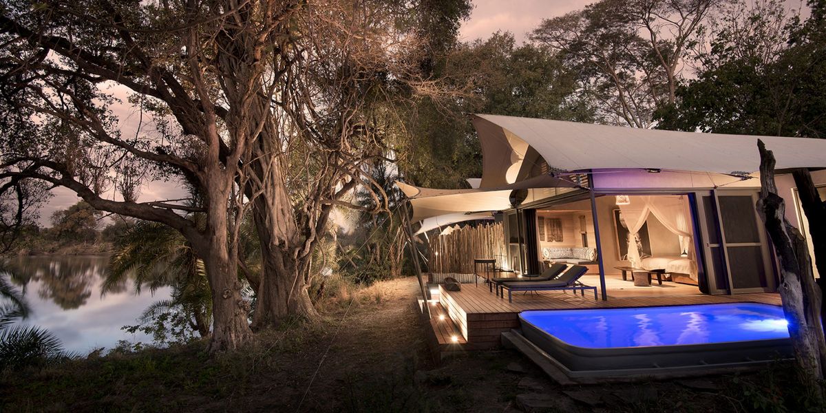 Perching on the river edge are the twelve luxurious tented suites. Each unit has its own indoor and outdoor bathrooms, as well as a luxurious private plunge pool. The main lodge consists of a lounge with an open dining area, where the fine dining experience of African cuisine will come to life. The dining room flows into a private, temperature controlled wine cellar stocked with the finest wines. A gym and spa overlook the mighty Zambezi River, and there is a small library with WIFI. The communal deck is set on the edge of the stunning riverside, and is home to a sunken boma area and an infinity pool.