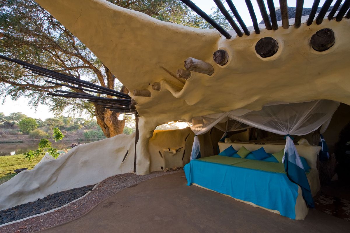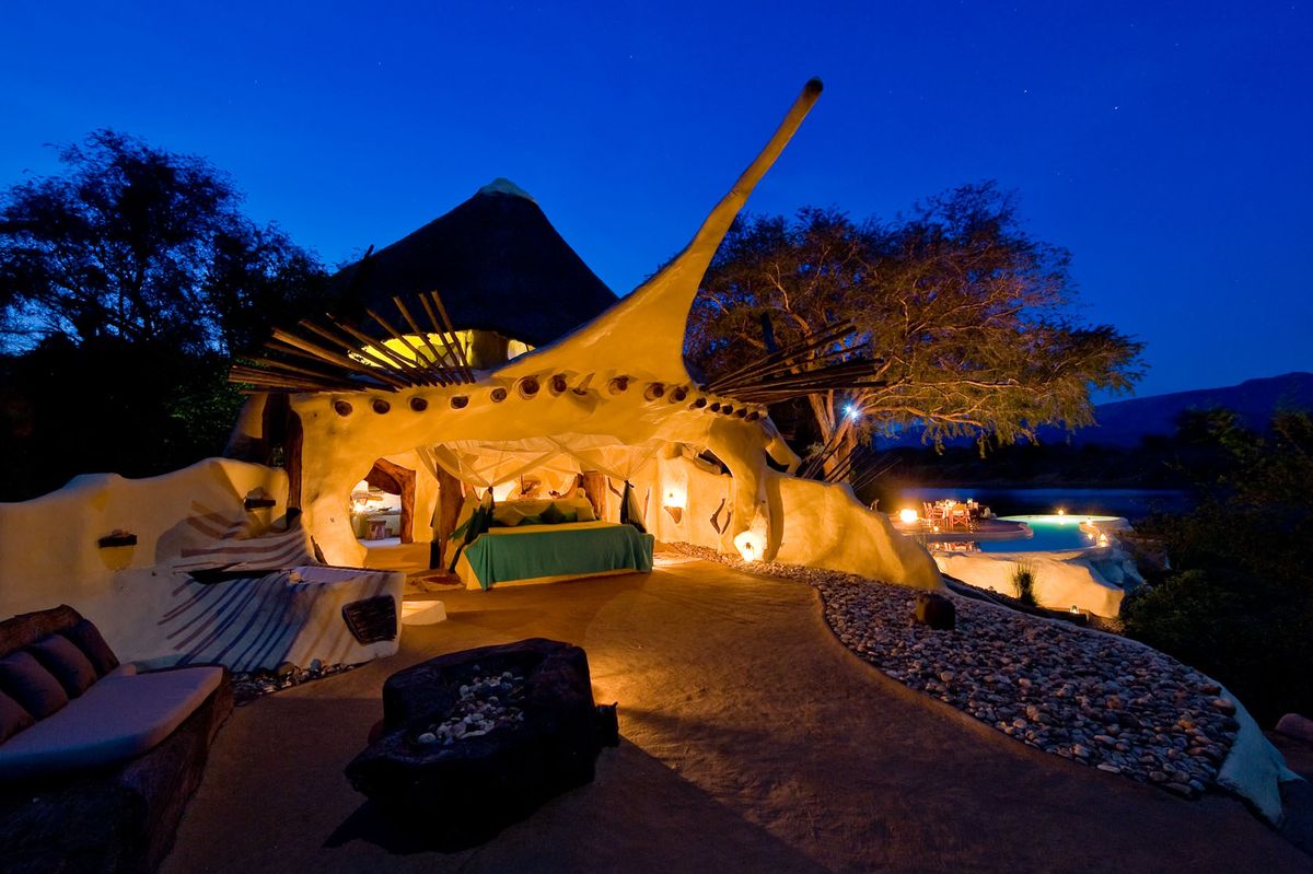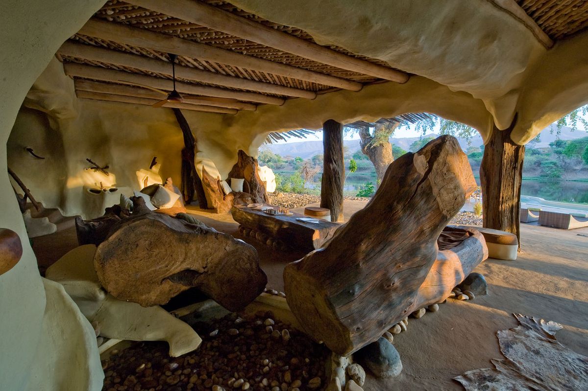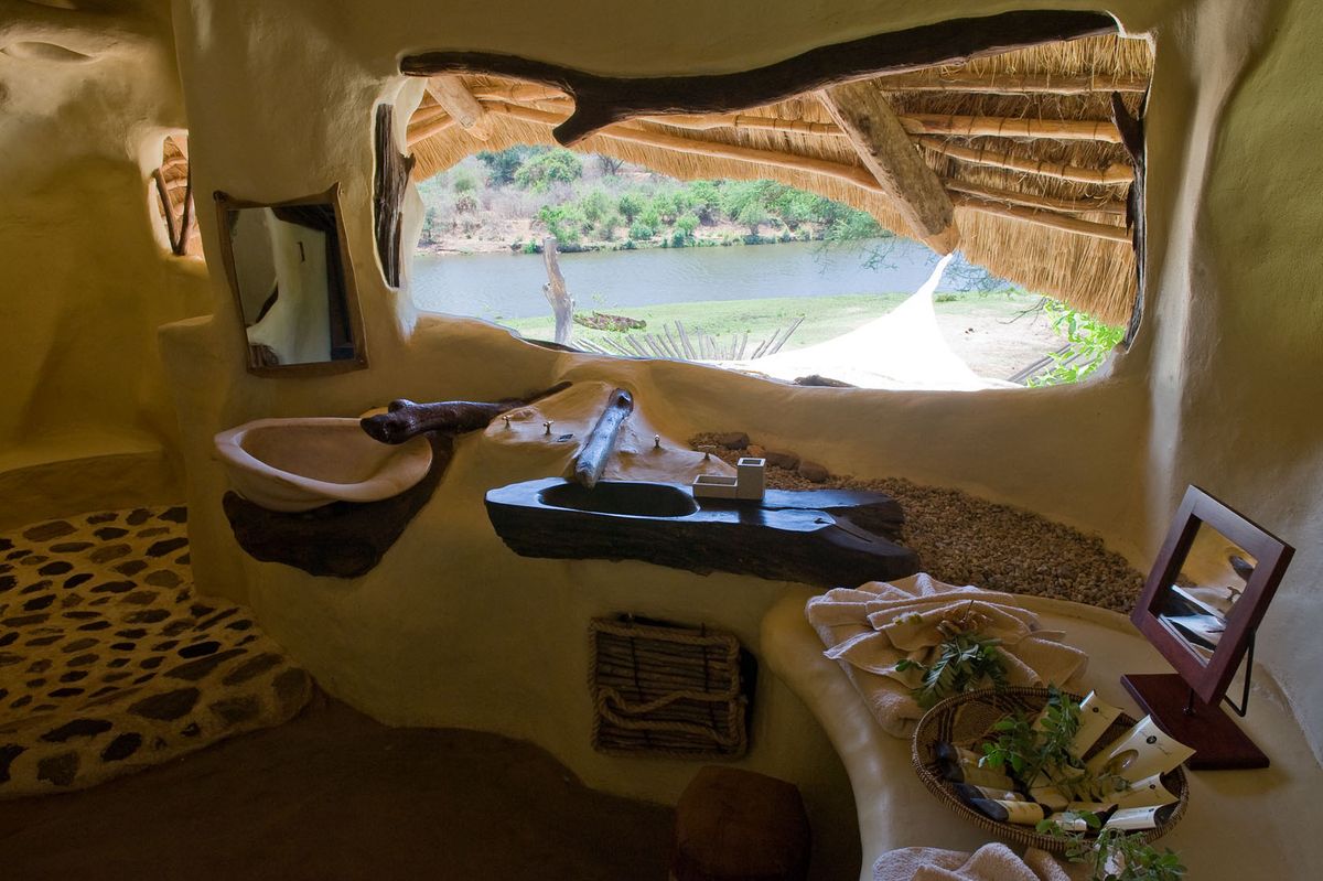 The four-bedroomed house has been built around a frame of wild wood with ferro walls following the natural lines of the branches. All the furniture in the sitting room has been carved from a single fallen winterthorn tree and colored pebbles from the river decorate the ceilings. Nature has been brought into the house. The views over the river are peaceful and beautiful. The golden glow of a sunset reflects magically on the calm waters lined with dense groves of trees.