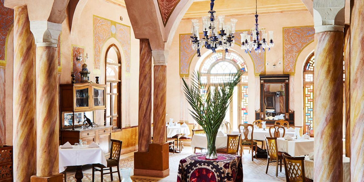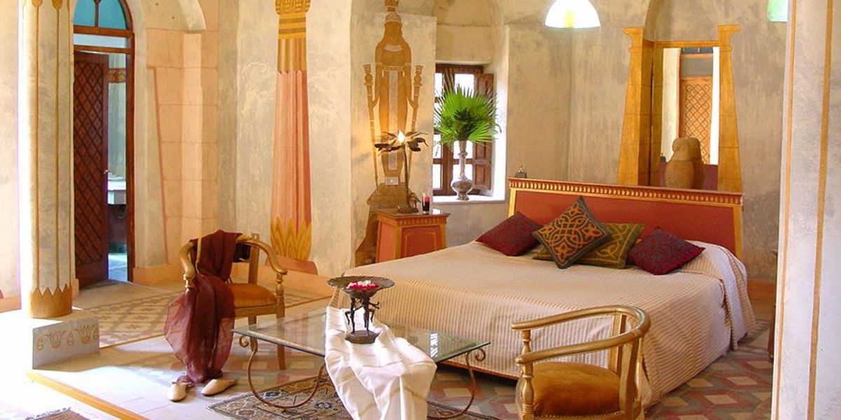 Al Moudira is on the west bank of the Nile, at the gateway to Luxor. The hotel is an oasis of greenery surrounded by the desert, with a eight-hectare garden with a variety of fruit trees: lemon, orange, mandarin, mango and guava. Palm trees, hibiscus and eucalyptus line the brick paths. In the middle of the garden is a pool, a sanctuary of freshness perfectly integrated into the natural setting.