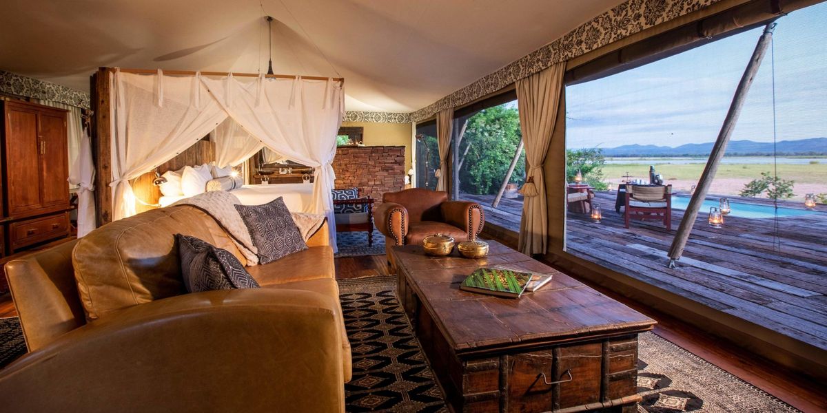 Tembo Plains Camp has four double or twin bed configuration suites. Each has its own private indoor lounge area, outdoor swimming pool and outdoor dining area. Each suite comes complete with a professional camera and lenses. High-quality binoculars are also available for guests to use during their stay. In addition to these suites, Tembo Plains has a beautiful 2-bedroomed suite comprised of two suites flanking a shared lounge, dining area and pool. The Tembo Plains Suite is ideal for two couples or families traveling together and those guests looking for the ultimate private safari.