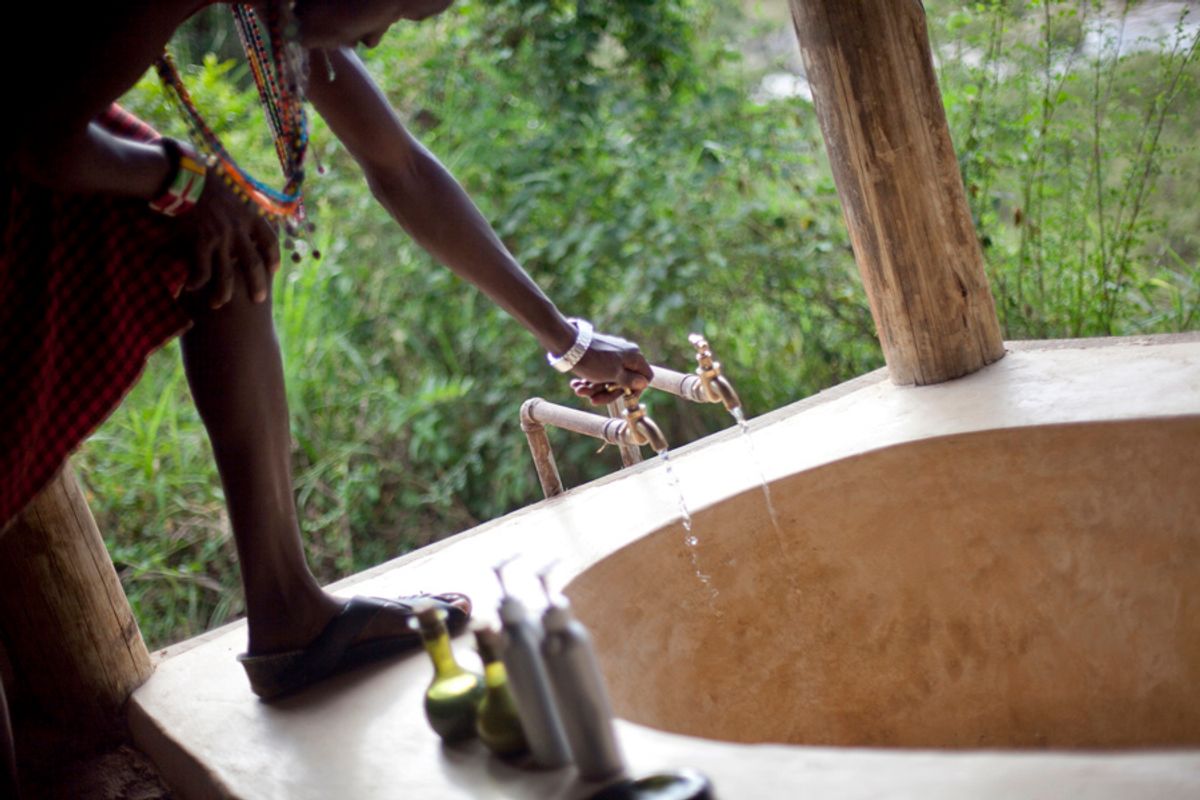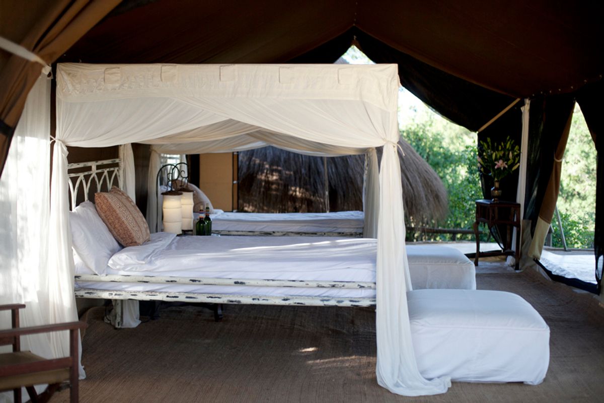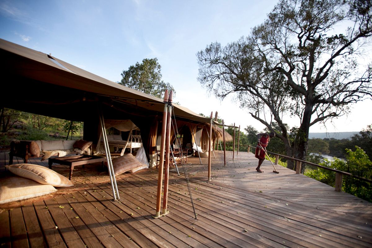 There are five en-suite marque tents, each furnished in rich warm textures mixed with natural hard woods, comfortable colonial style furnishing with a little eastern spice. The tents are large and spacious and have private verandas where you can sit and watch the sun rise or muse over the days game viewing with refreshing pre-dinner drink. The beautiful bush bathrooms offer views over the river valley as you soak in your tub, and this openness simulates the delicious sensation of being outdoors.