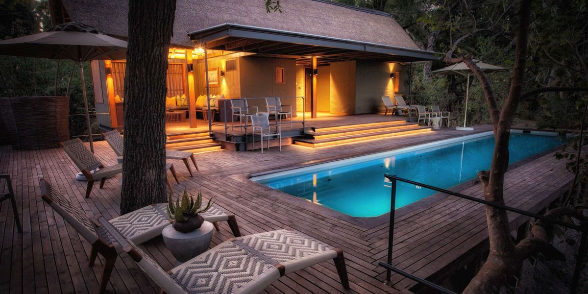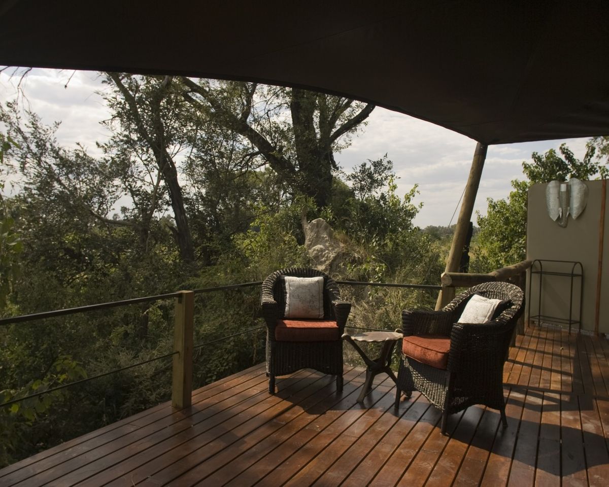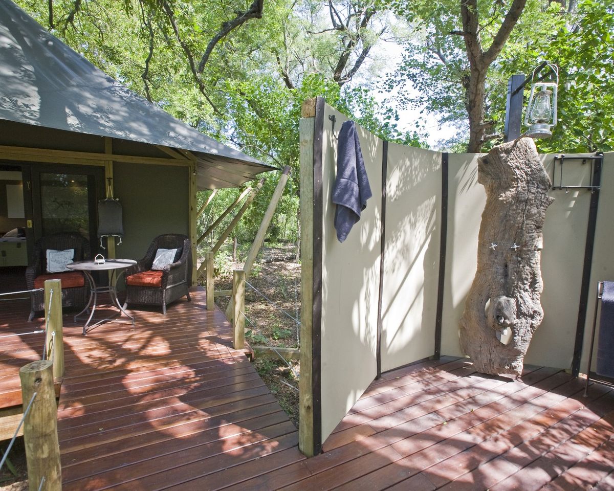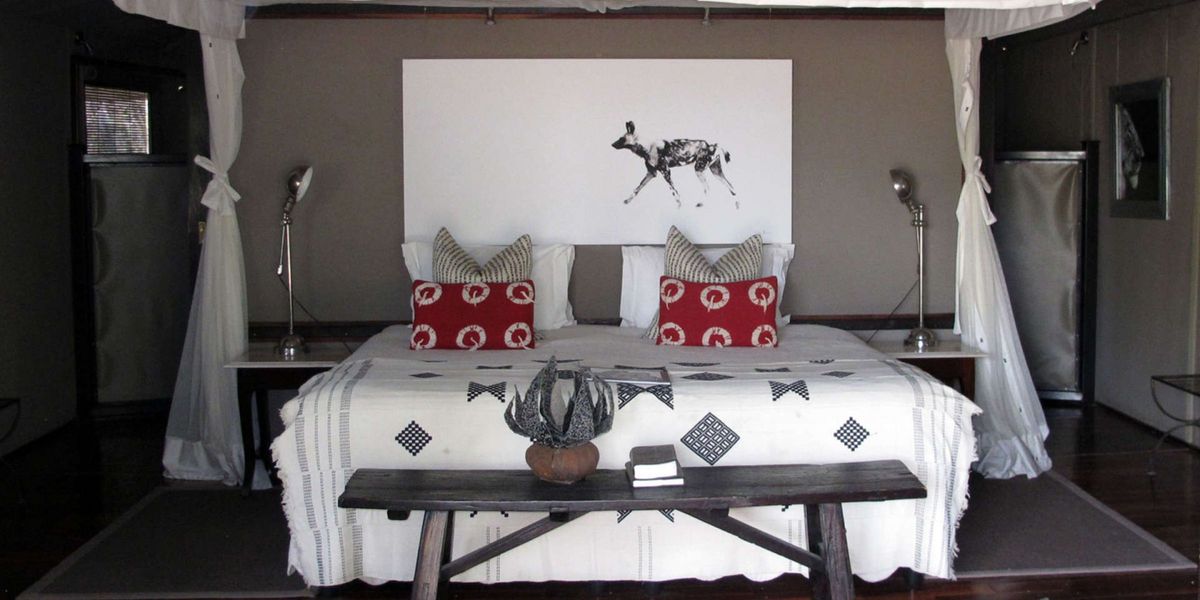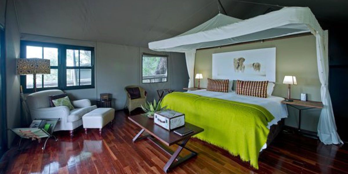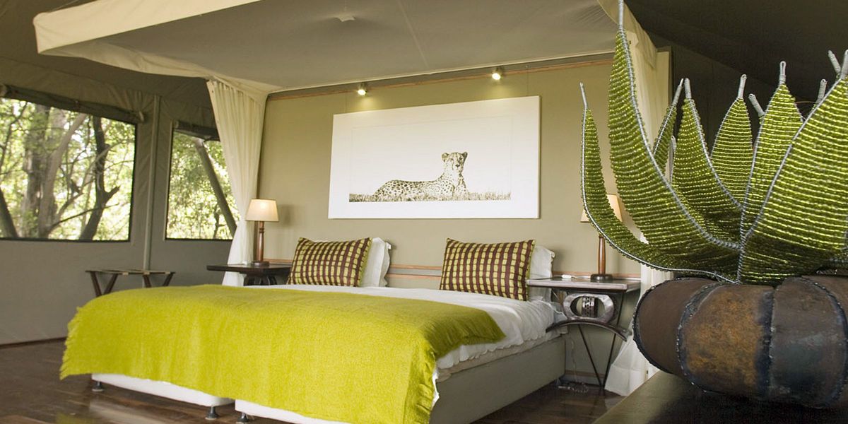 Each luxurious Meru- style tent is built on elevated wooden decks beneath a lush tree canopy. The spacious tented rooms all have en-suite bathroom facilities with flush toilets and both outdoor and indoor showers. Comfortable beds with crisp linens are set amid African-inspired decor. The thatched main dining area, lounge and pub are also raised on decks overlooking the surrounding flood plains so that guests may marvel at any passing wildlife that may wander by. A pool allows guests to cool off from the heat of a long safari adventure.