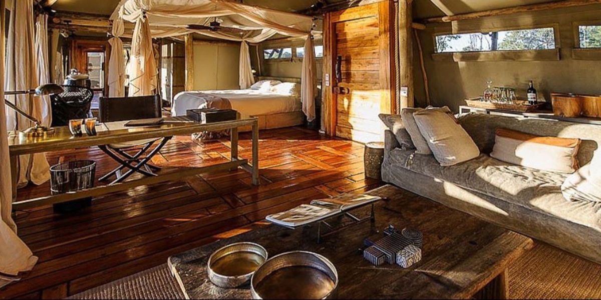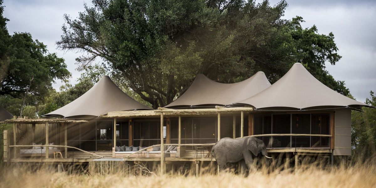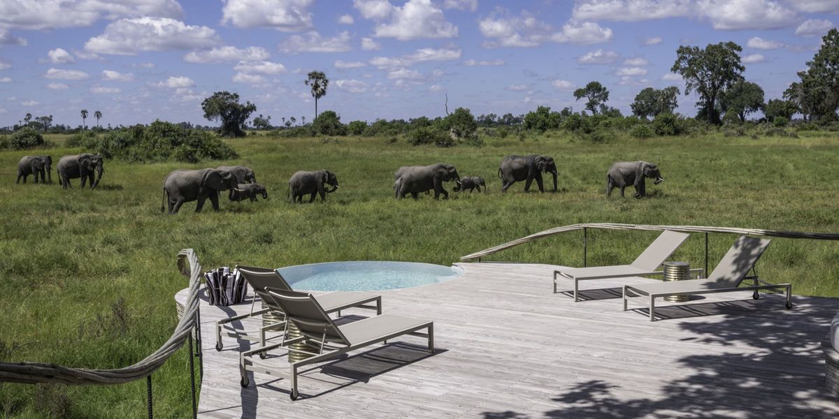 With just four tents tucked away on the other side of the same island, Little Mombo is connected via a raised walkway to Mombo Camp. Built under a shady canopy of jackalberry and sausage trees, overlooking a floodplain regularly visited by herds of herbivores (and their predators), the camp has its own facilities, including a dining area, boma, kitchen, lounge and pool.