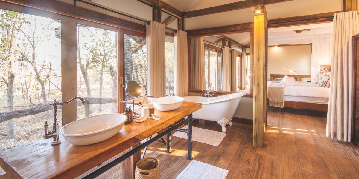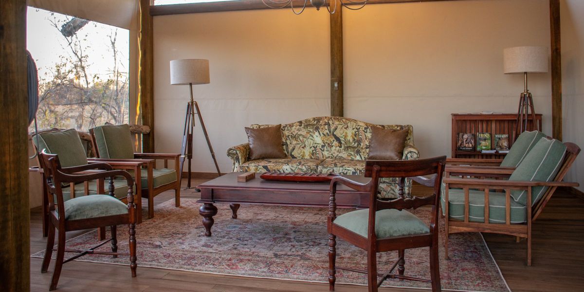 The nine canvas tents overlook the seasonal lagoon. Each very spacious tent has a lounge area, an ensuite bathroom with both indoor and outdoor showers and a gorgeous bath. Resident hippo will generally serenade you year round from the water on the floodplain in front of the camp. The Camp also has two small pool areas at each end of the camp providing guests with more private lounge areas.