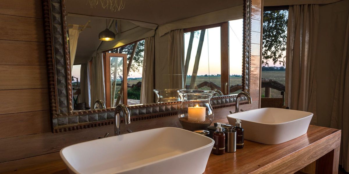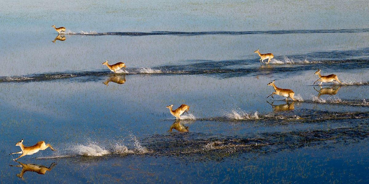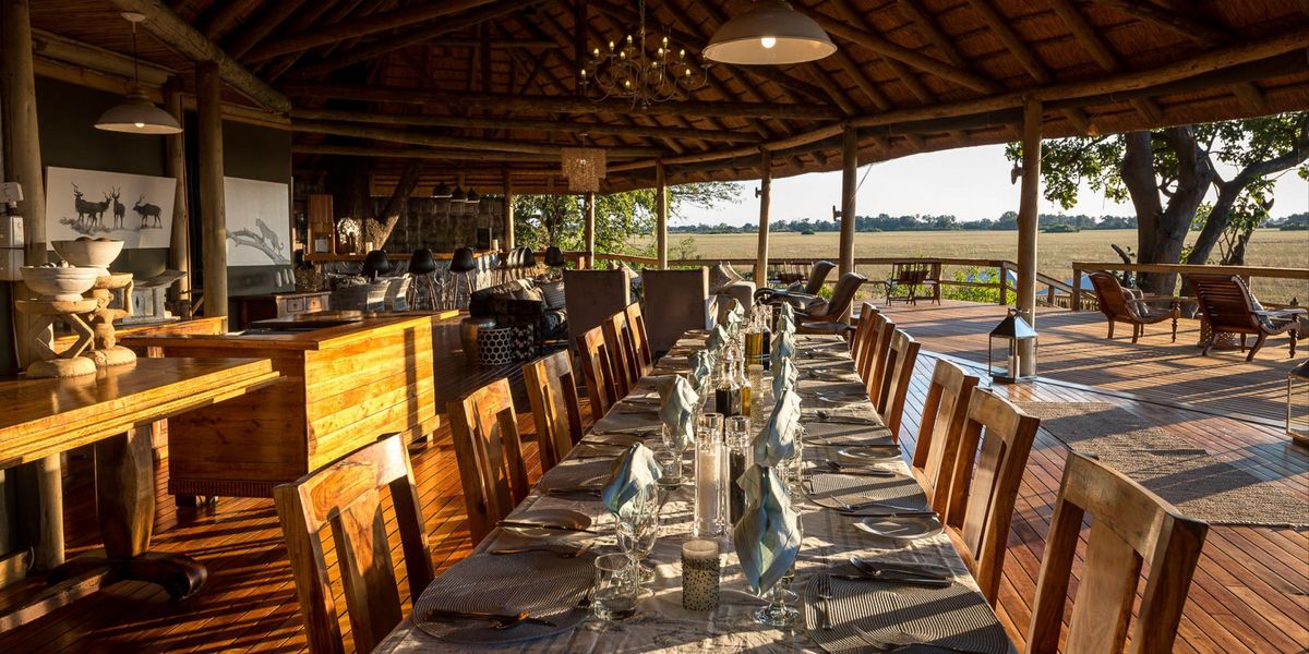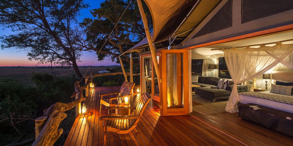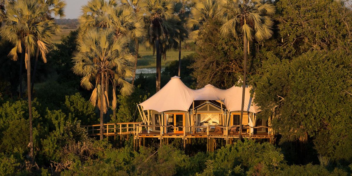 Located in the center of the private Jao Concession in the Okavango Delta , Botswana, Kwetsani Camp sits on an elongated island covered with palm, mangosteen and fig trees. The surrounding floodplains are home to a number of “Delta specials” – species that are found in few other places on Earth. Some of these may even be seen from the privacy of one of our five luxurious “treehouse” chalets, beautifully furnished en-suite rooms each comprising a bedroom and lounge, and made of canvas, wood and glass.