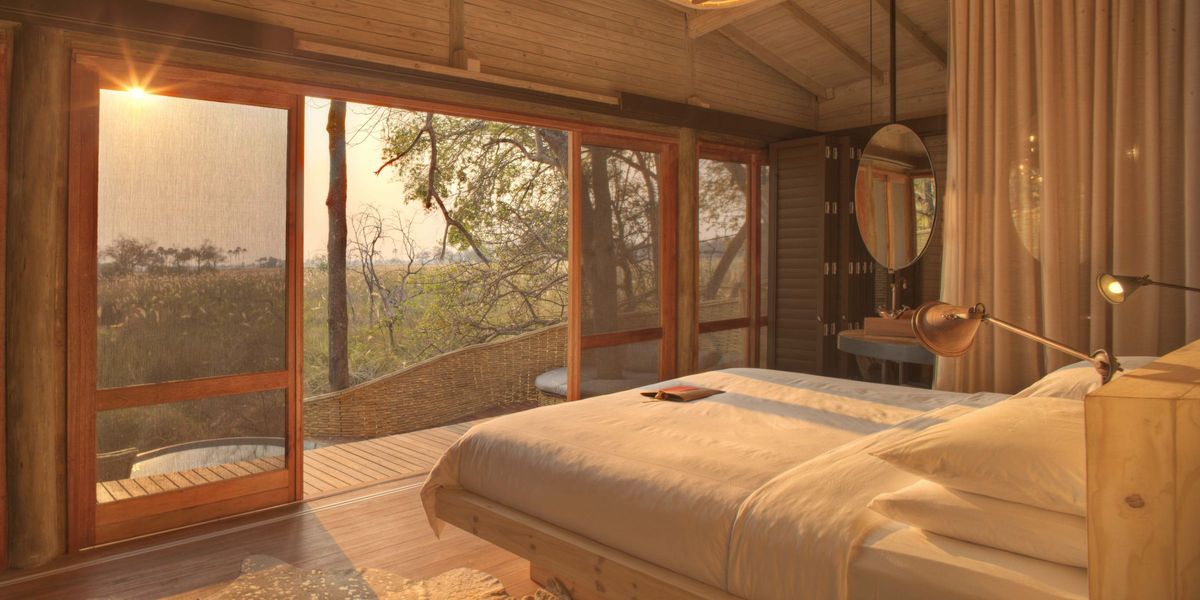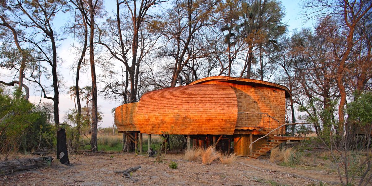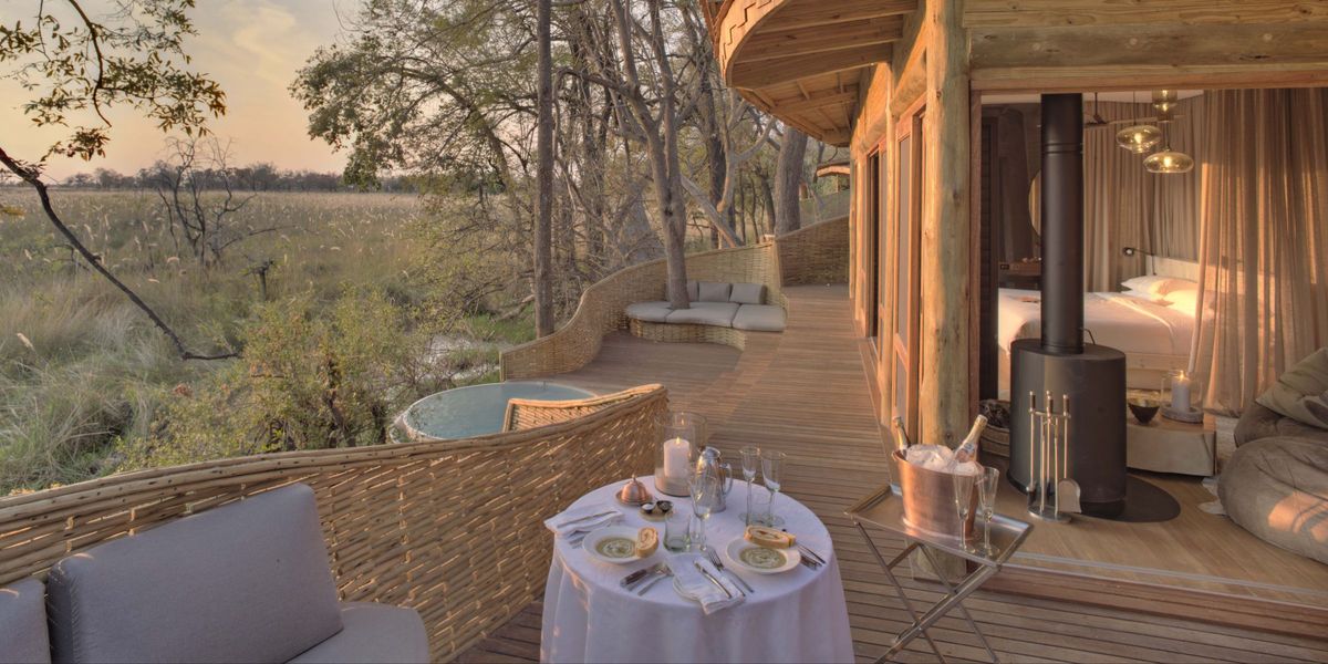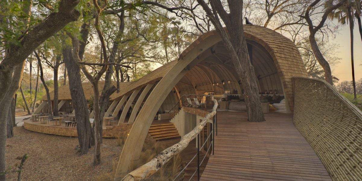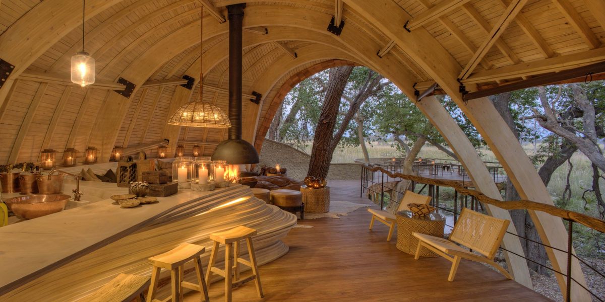 A series of decks descend to the forest floor culminating in a log boma, with a small gym and private massage sala close by. Interior finishes throughout showcase the craftsmanship of Botswana’s artisans, and feature intricate basket ware, sculpted wooden tables and unique feature pieces. While the main guest area is set within the forest, the twelve guest suites peep out from beneath its canopy. Raised above the papyrus-lined banks like golden weaver nests, each is a cocoon of privacy, with breathtaking views, a private plunge pool and cozy fireplace. Guests can experience guided walking safaris, game drives and mokoro boat excursions.