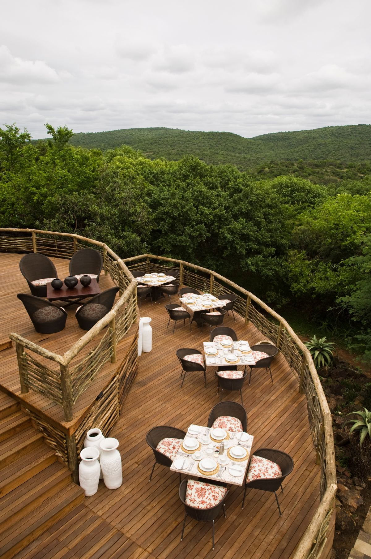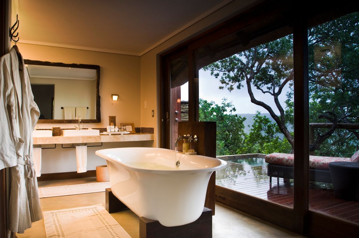 Phinda Mountain Lodge features three room types, with 16 suites, six cottages (that can be turned into three adjoining family cottages), and one family suite. Private decks provide breathtaking views. Each accommodation option features an outdoor shower, well-stocked personal bars and private plunge pools.