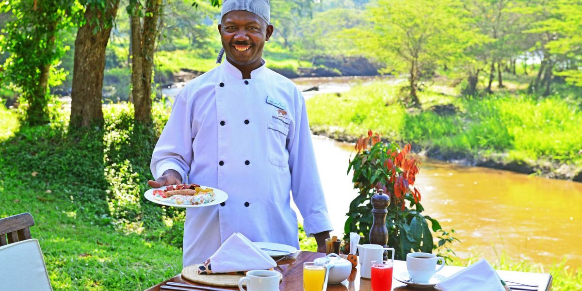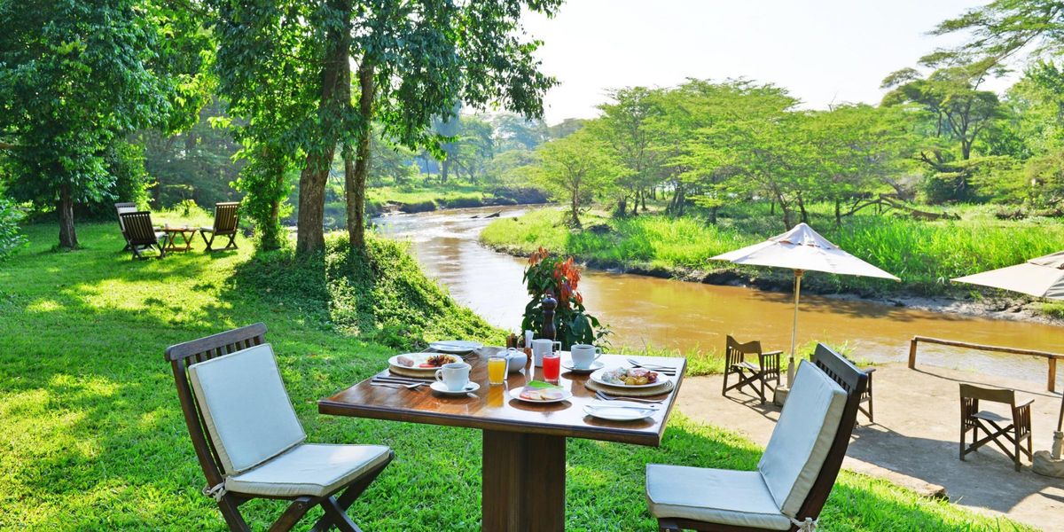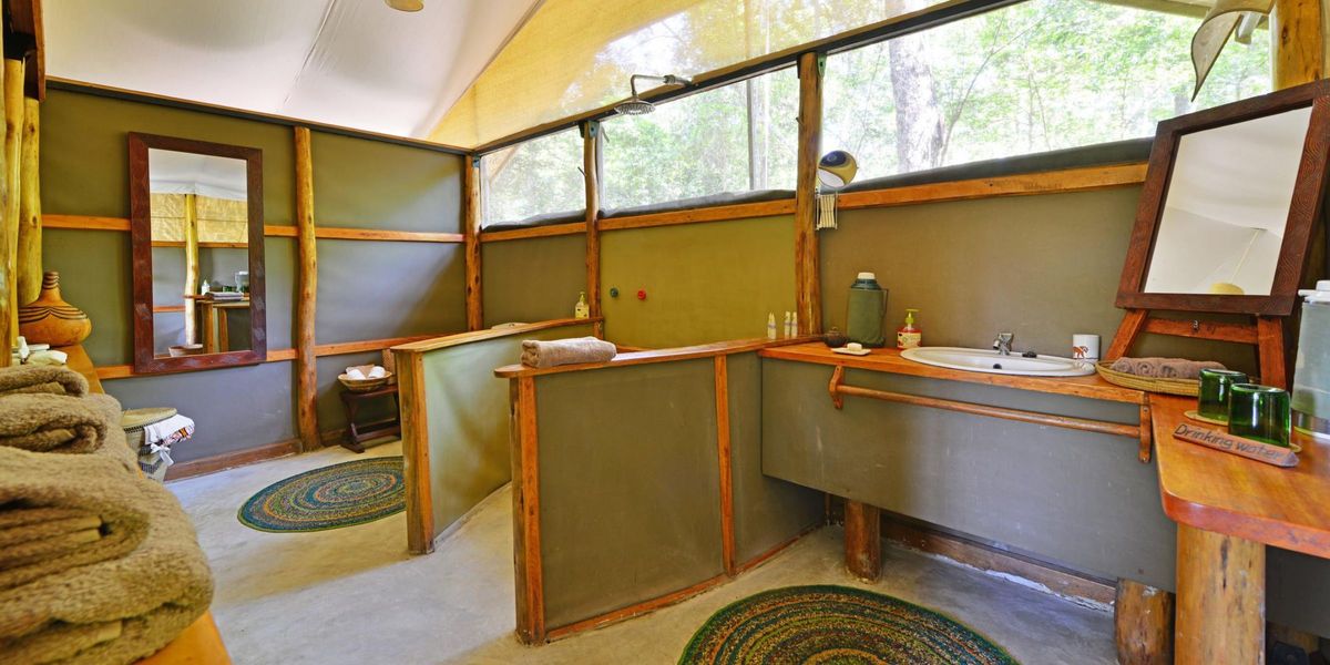 Each of the ten spacious East African style Meru tents, situated in the wooded area besides the river, is comfortably furnished and with its own private en suite bathroom and dressing area providing solar powered showers and an eco friendly toilet. A central dining area, also under canvas, provides a comfortable environment for delicious meals. The outdoor lounge area beside the river is great for bird watching during the day, and in the evening guests can relax around a cozy fire and discuss the days events. All this combined offers a truly African bush experience in total comfort.