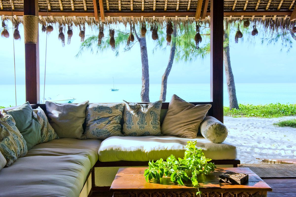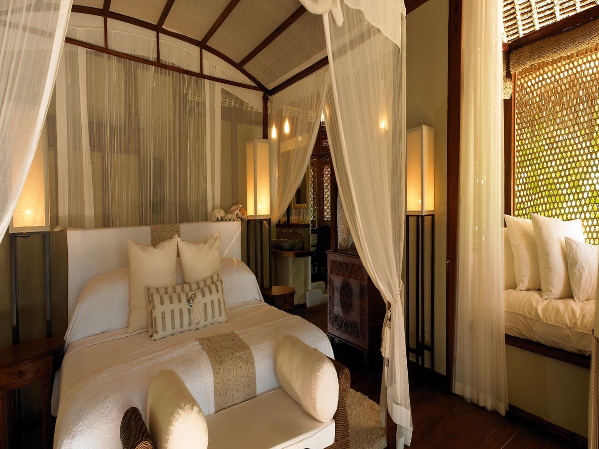 Each villa includes its own large living room, spectacular bathroom and breezy veranda. The houses are all secluded from each other and look out to sea from the shade of the forest that forms the center of the island. Samango monkeys play in the trees and prowl the glades, hunting the land crabs that live there. The decor of the Vamizi Island lodge incorporates as much of the traditional design of the region as possible. Private lounges from the bedrooms are like giant verandas, with deep cane couches and colonial-style chairs. The cuisine at Vamizi Island has an emphasis on fresh seafood including lobster, prawns, calamari, crab and assorted fish. The outside decks and private beaches have a selection of loungers, swinging beds and local Swahili day beds to chose from, to encourage guests to relax wherever they wish.