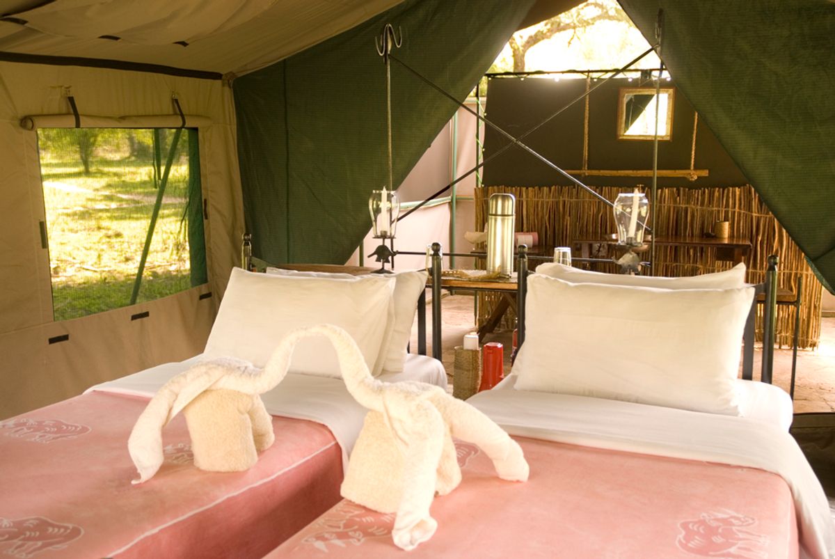 The camp consists of twelve tents, all well-spaced apart offering a degree of privacy and tranquility, but all still with good views of the lake. The tents are 'meru-style' canvas with double zip locking and mesh windows to keep it relaxing and insect-free. Doum palms and Terminalia offer shade to all of the tents to keep them cool and refreshing after a long day of safari activities. Each tent has an en-suite bathroom with flush toilet and hot shower and is furnished with twin or double beds. They are spacious, with a comfortable veranda to watch the animals passing by.