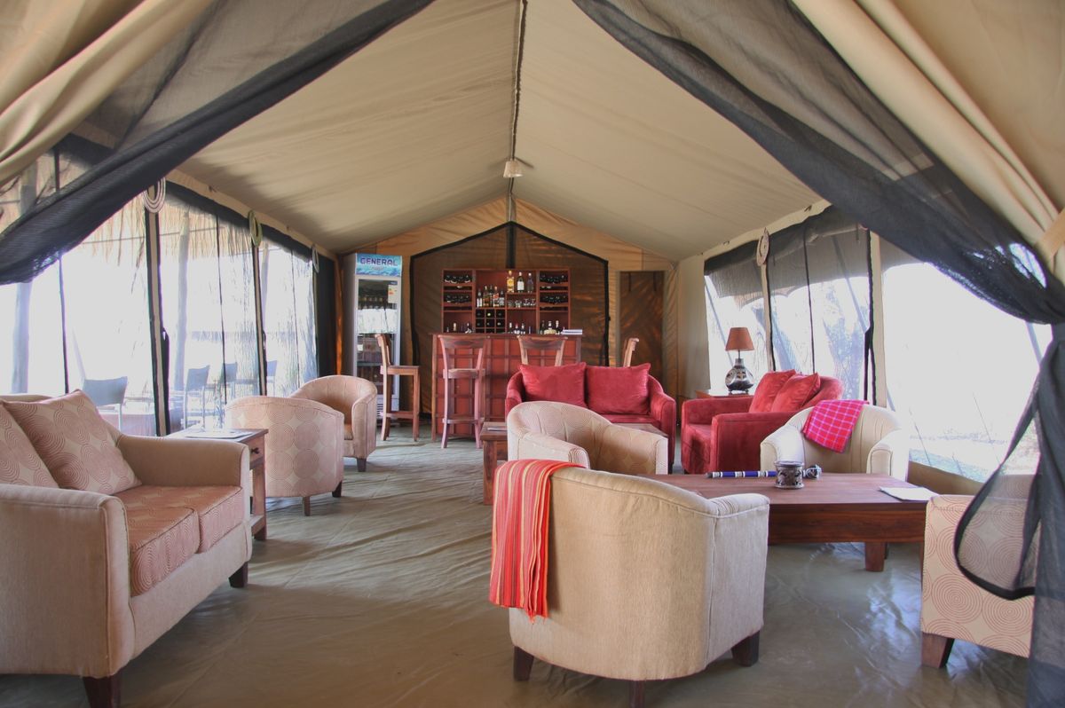 The immediate area offers excellent year round wildlife viewing due to dense resident populations of large game including: lion, leopard, cheetah, elephant, giraffe, hippo, buffalo and several species of antelope. When the great wildebeest and zebra migration thunders through twice a year, game viewing is unbeatable. The deliberately rustic eco-lodge is managed in tune with the surrounding pristine wilderness. Accommodations consist of just six spacious tents with en suite bathrooms and a comfortable bed round.There is a main lodge tent, which contains the lounge, library, dining room, bar and sundowner/fire pit area. Gourmet meals may be served by the flicker of candle lamps with the stars overhead.