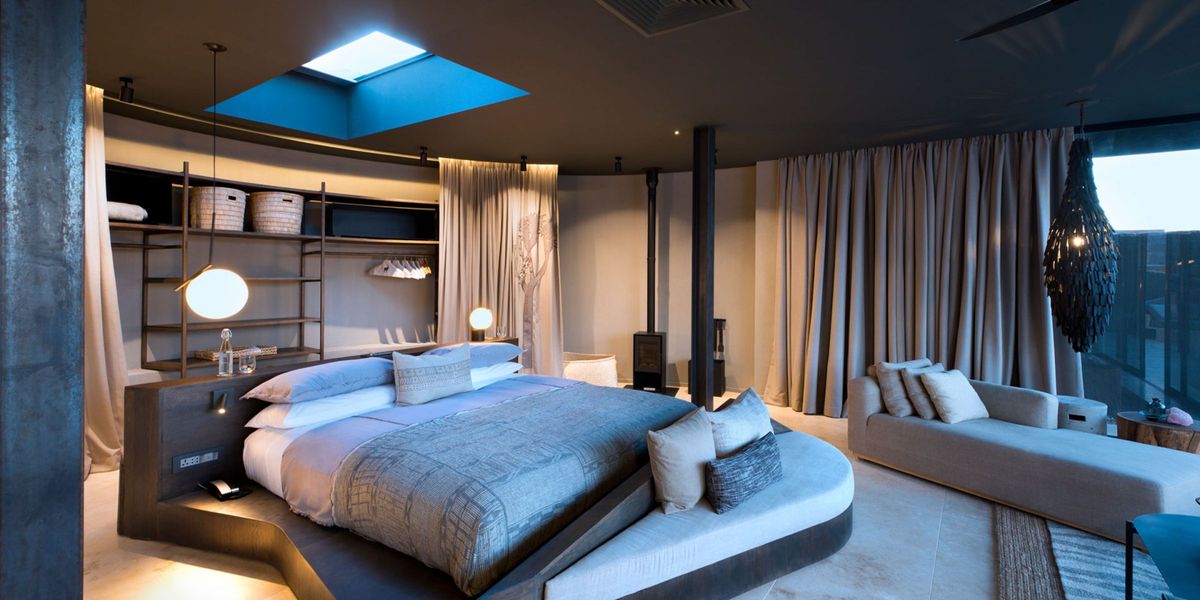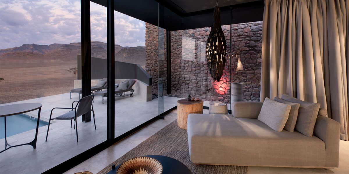 The stone and glass desert suites combine unprecedented sophistication with the stark beauty of the desert landscape. Each spacious air conditioned suite offers a secluded, shaded veranda complete with private plunge pool, a living room with a fireplace, a large retractable skylight above the bed, and an ensuite bathroom with a glass-encased rain shower offering 180º desert views.